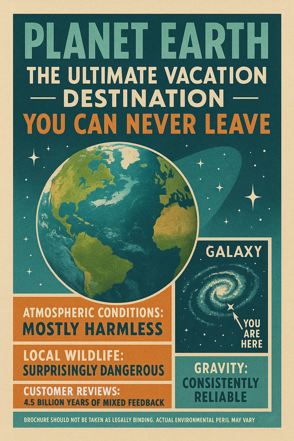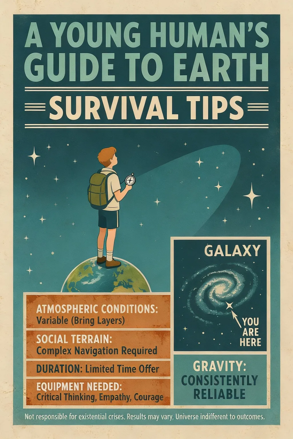 The result is A Young Human's Guide to Earth, 10 chapters blending planetary science with social dynamics, explaining why rocks are diaries, why social pressure operates like atmospheric pressure, why your personality is geology in slow motion and how to navigate being a conscious arrangement of atoms on an active planet during interesting times.